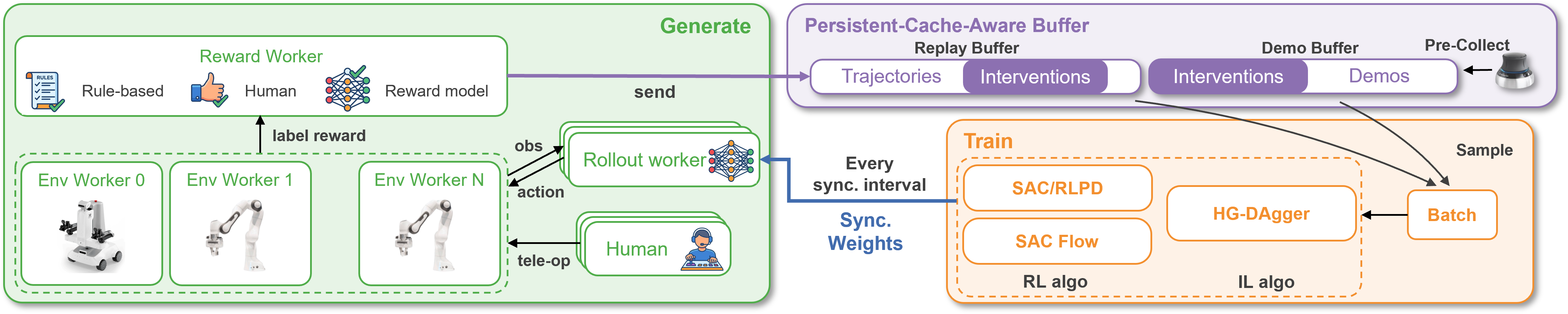 Here is a fully asynchronous real-world learning pipeline with a persistent, cache-aware buffer and extensible abstractions for policies, algorithms, and reward models.