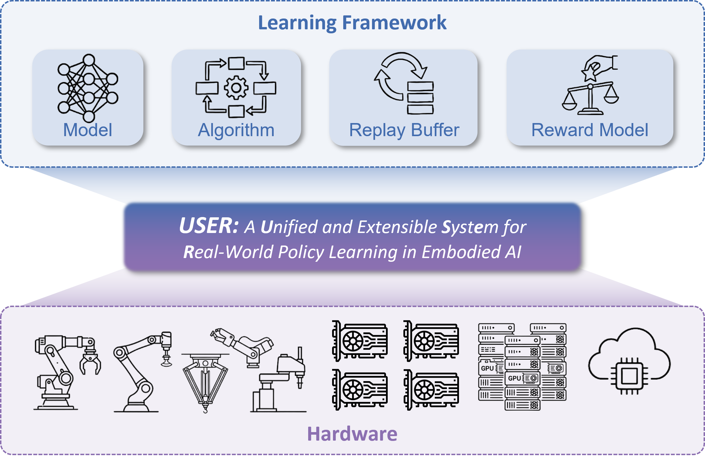Online policy learning directly in the physical world is a promising yet challenging direction for embodied intelligence. Unlike simulation, real-world systems cannot be arbitrarily accelerated, cheaply reset, or massively replicated, which makes scalable data collection, heterogeneous deployment, and longhorizon effective training difficult. These challenges suggest that real-world policy learning is not only an algorithmic issue but fundamentally a systems problem. We present USER, a Unified and extensible SystEm for Real-world online policy learning. USER treats physical robots as first-class hardware resources alongside GPUs through a unified hardware abstraction layer, enabling automatic discovery, management, and scheduling of heterogeneous robots. To address cloud–edge communication, USER introduces an adaptive communication plane with tunnelingbased networking, distributed data channels for traffic localization, and streaming-multiprocessor-aware weight synchronization to regulate GPU-side overhead. On top of this infrastructure, USER organizes learning as a fully asynchronous framework with a persistent, cache-aware buffer, enabling efficient long-horizon experiments with robust crash recovery and reuse of historical data. In addition, USER provides extensible abstractions for rewards, algorithms, and policies, supporting online imitation or reinforcement learning of CNN/MLP, generative policies, and large vision–language–action (VLA) models within a unified pipeline. Results in both simulation and the real world show that USER enables multi-robot coordination, heterogeneous manipulators, edge–cloud collaboration with large models, and longrunning asynchronous training, offering a unified and extensible systems foundation for real-world online policy learning. Our code is available in here.
